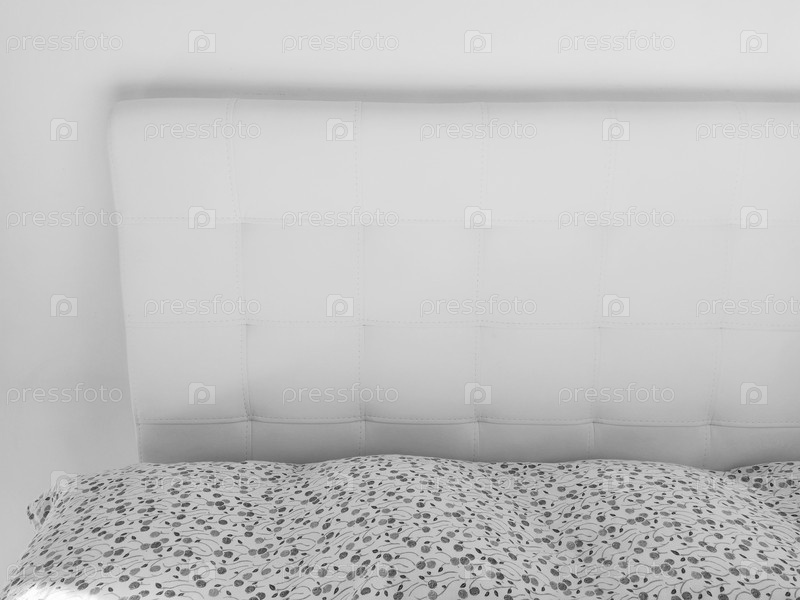 Мягкое изголовье. Обивка для мебели из натуральной или искусственной кожи и стеганой ткани. Мягкое изголовье у светлой стены. Черно-белое монохромное фото