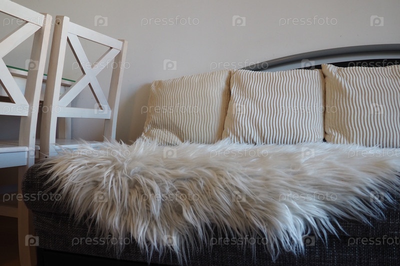 Серый диван с обивкой из букле и белыми декоративными гофрированными подушками. Белый коврик или покрывало из искусственного меха с длинным ворсом. Интерьер гостиной. Деревянные расписные стулья