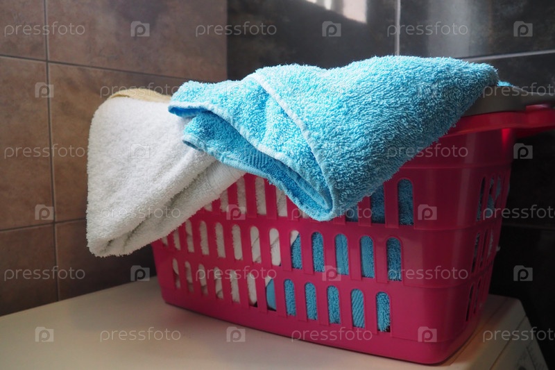 Полотенца в корзине для белья. Синие и розовые хлопковые махровые полотенца брошены в розовую пластиковую корзину. Уборка. Хранение и разделение белья перед стиркой. Свет сверху из открытого окна