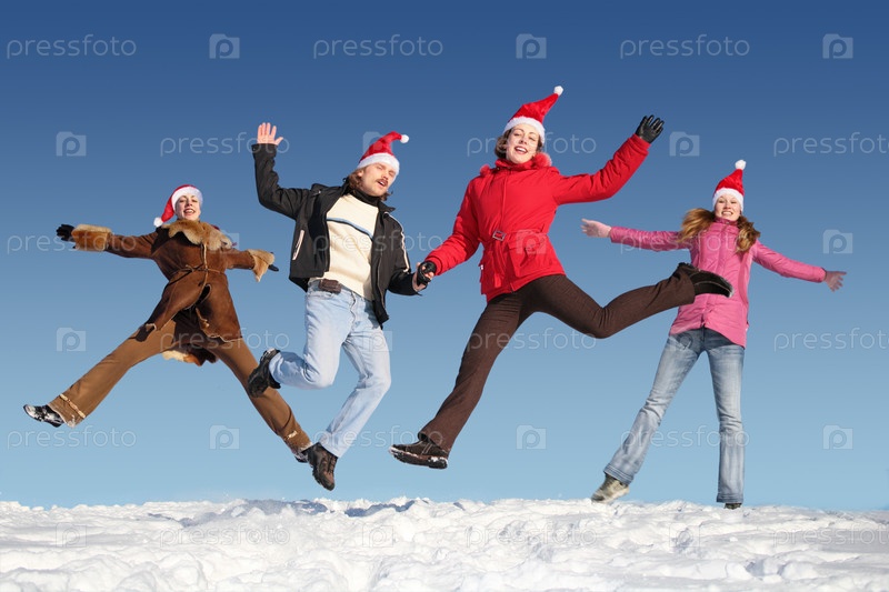 Молодые люди прыгают на снегу