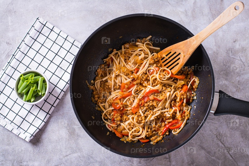 Лапша удон с соевым мясом и овощами в сковороде на столе сверху