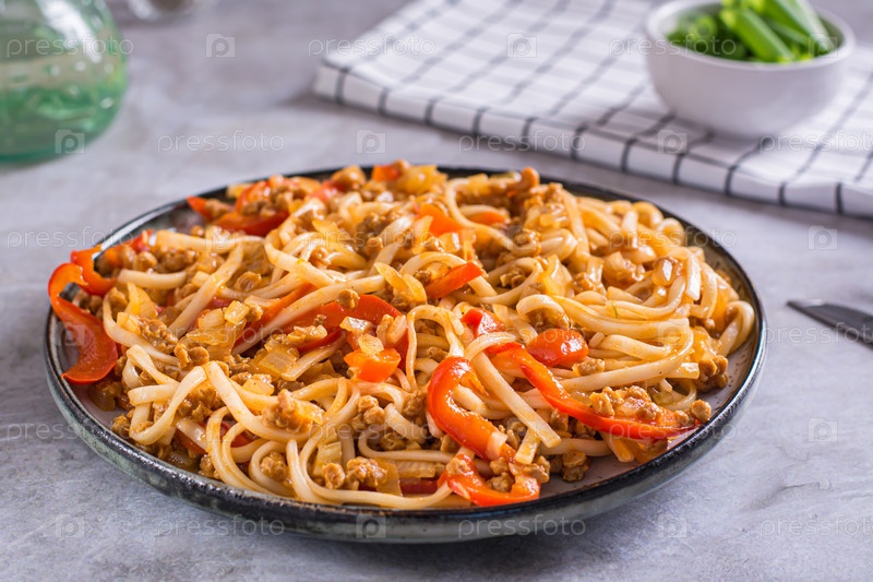 Лапша удон с соевым мясом и овощами на тарелке на столе