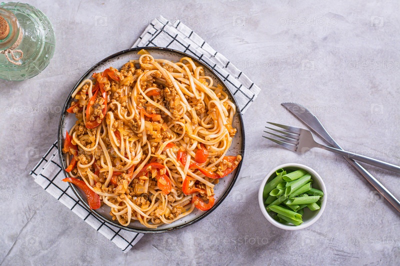 Лапша удон с соевым мясом и овощами на тарелке на столе сверху