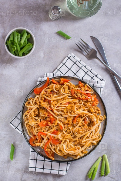 Вегетарианская лапша с соевым мясом, перцем и помидорами на тарелке на столешнице и вертикальный вид