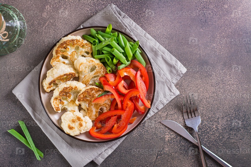 Стейки из цветной капусты с овощами и зеленью на тарелке на столе сверху