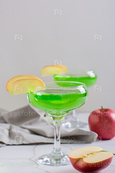 Домашний коктейль мартини из зеленого яблока с кусочками яблока в стаканах, вертикальный вид