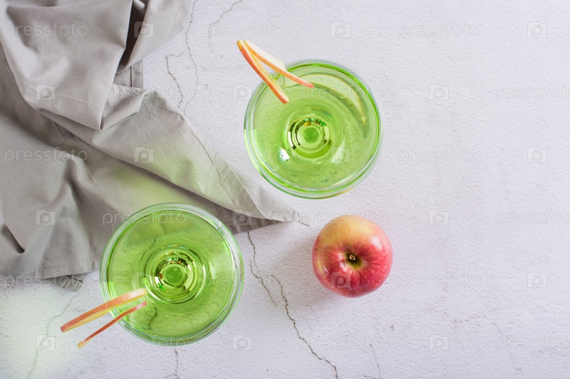 Домашний коктейль мартини из зеленого яблока с кусочками яблока в стаканах, вид сверху