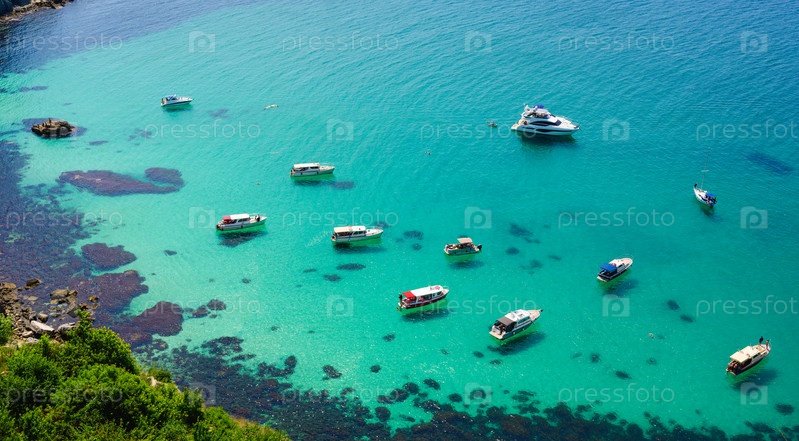 Скопление туристических яхт и катеров в морской бухте. Вид сверху. Концепция тропического отдыха. Выборочный фокус в центре кадра