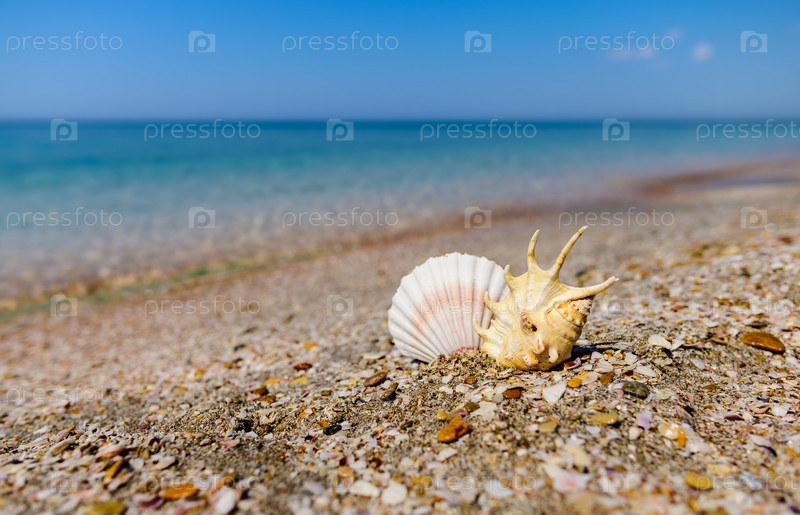 Красивый морской пейзаж с ракушками на фоне прозрачной голубой воды. Селективный фокус на ближайшей шипованной раковине