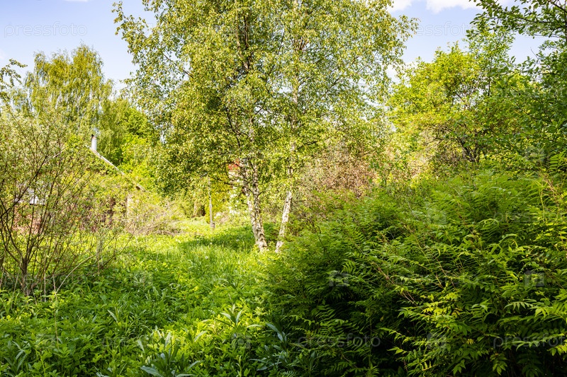 Вид на зеленый заросший задний двор в деревне
