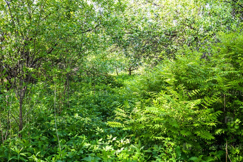 Густой подлесок в заросшем дворе в деревне