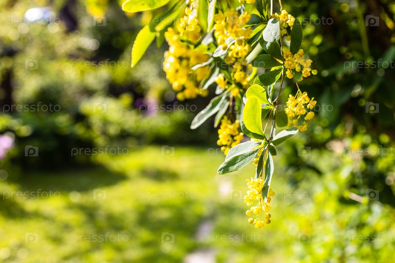 Желтый цветок барбариса, освещенный заходящим солнцем