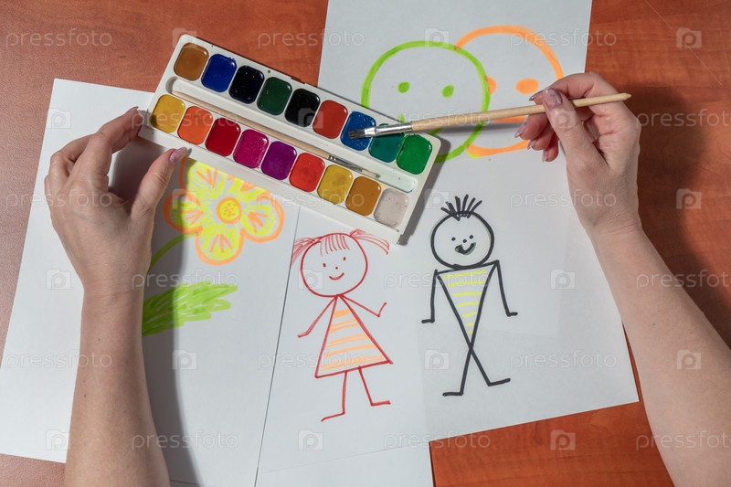 Женщина рисует человечков фломастерами на белом листе. Сидя за столом. Вид сверху