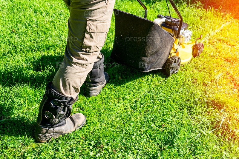 Мужчина косит газон желтой газонокосилкой на заднем дворе, яркое солнце