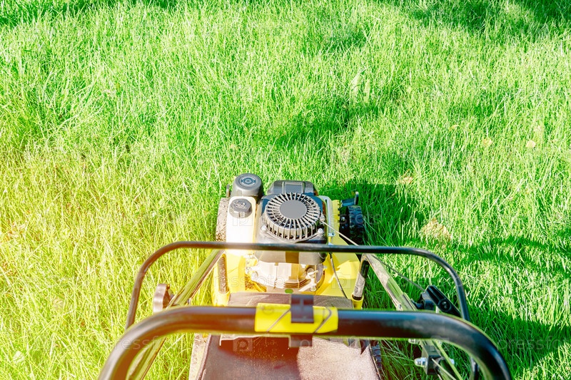 Мужчина косит газон желтой газонокосилкой на заднем дворе, яркое солнце