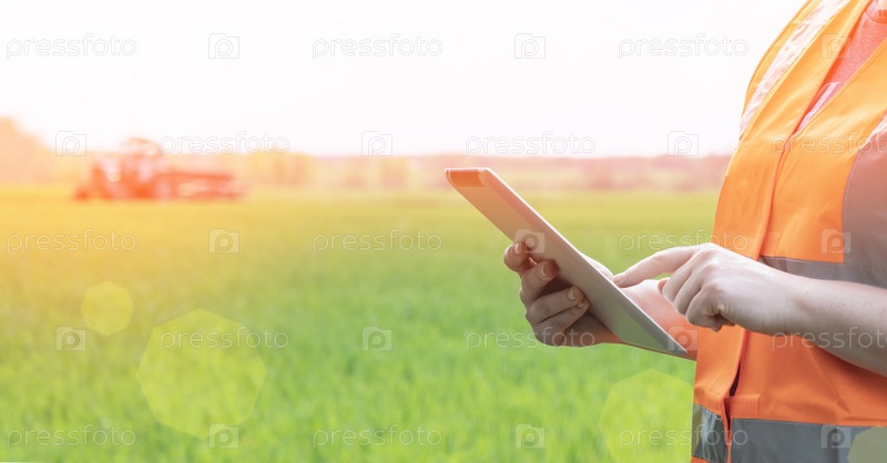 Фермер с белой таблеткой смотрит на зеленые саженцы урожая