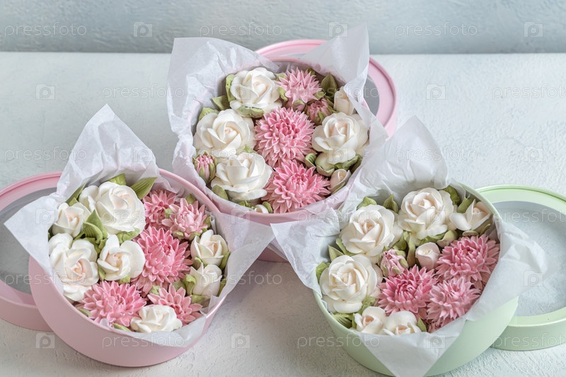Зефирный букет цветов в подарочной коробке на светлом фоне