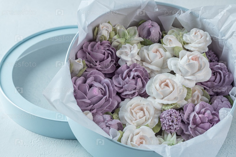 Зефирный букет цветов в подарочной коробке на светлом фоне
