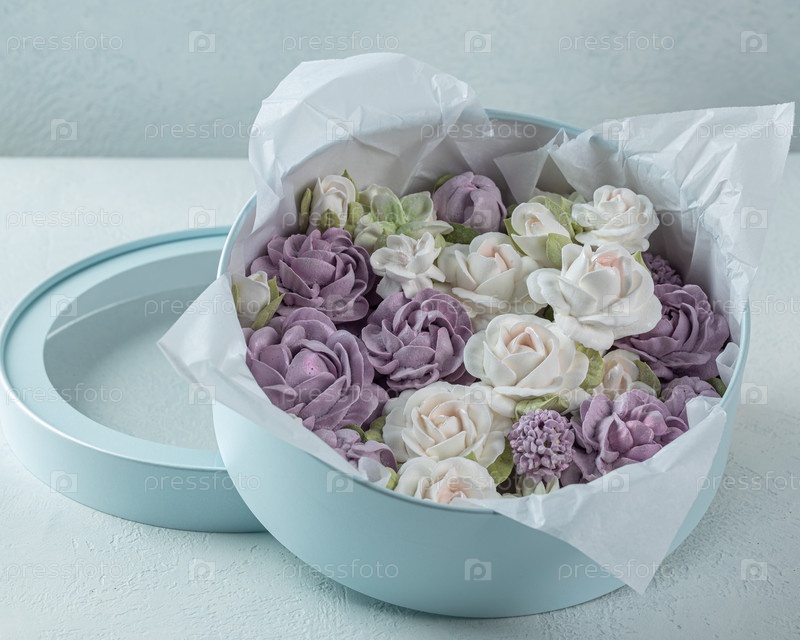 Зефирный букет цветов в подарочной коробке на светлом фоне