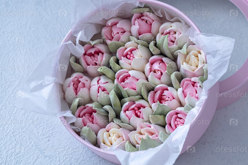 Зефирный букет цветов в подарочной коробке на светлом фоне
