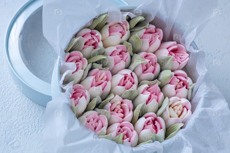 Зефирный букет цветов в подарочной коробке на светлом фоне