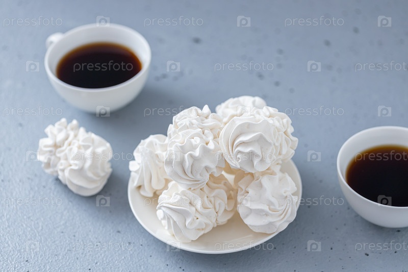 Домашний зефир или зефир с чашкой кофе на сером бетонном фоне. вид сбоку, крупный план, выборочный фокус