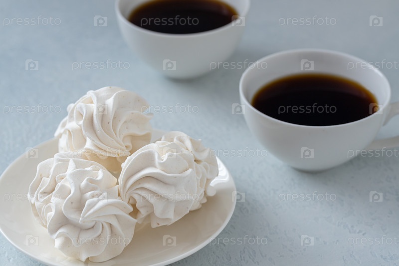 Домашний зефир или зефир с чашкой кофе на сером бетонном фоне. вид сбоку, крупный план, выборочный фокус