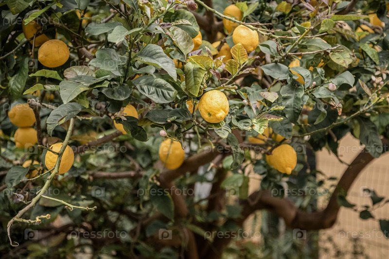 Спелые плоды лимона среди зеленых листьев на дереве в цитрусовом саду