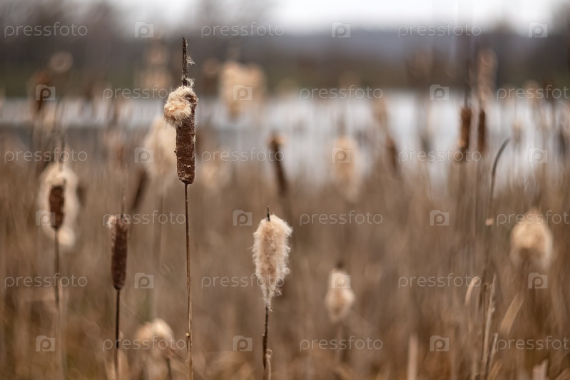 В озере растут сухие рогозы