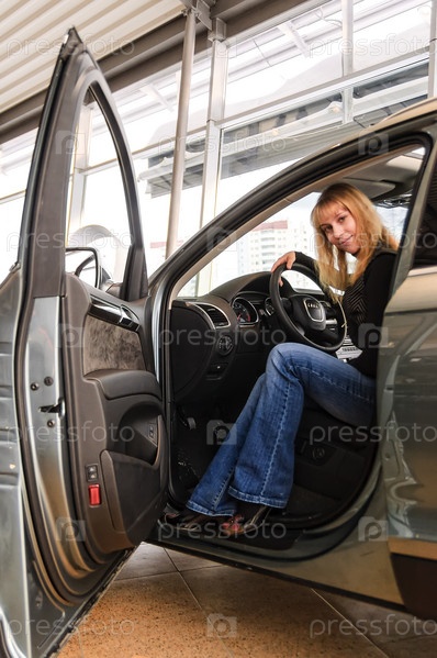 Привлекательная блондинка сидит в новой машине в автомагазине