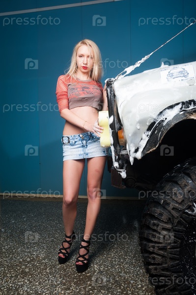 Привлекательная сексуальная женщина моет внедорожник губкой