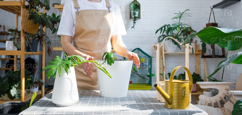 Женщина в фартуке держит укоренившийся стебель домашнего растения филодендрон майонез для посадки в белый горшок, макет шаблона. Посадка и уход, теплица