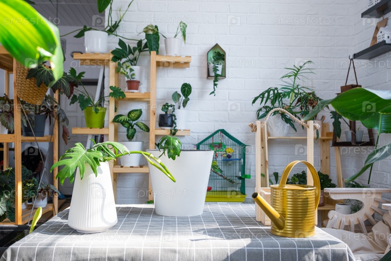 Посадка домашнего растения филодендрон с укоренившимся стеблем в новый горшок в интерьере дома. Уход за растением в горшке, земляной ком с корнями, раскладка садового инвентаря на столе