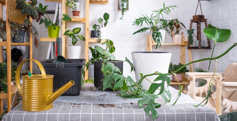 Пересадка домашнего растения Филодендрон в новый горшок в интерьере дома. Уход за растением в горшке, земляной ком с корнями, раскладка садового инвентаря на столе
