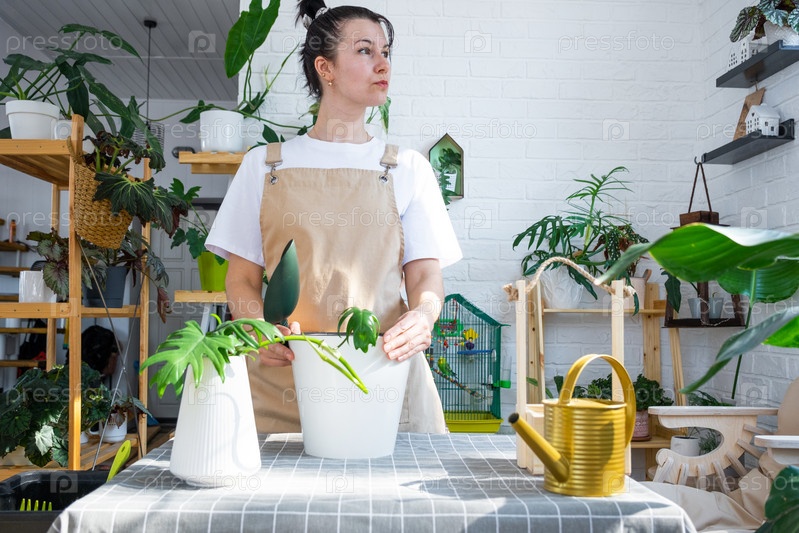Женщина в фартуке держит укоренившийся стебель домашнего растения филодендрон майонез для посадки в белый горшок, макет шаблона. Посадка и уход, теплица