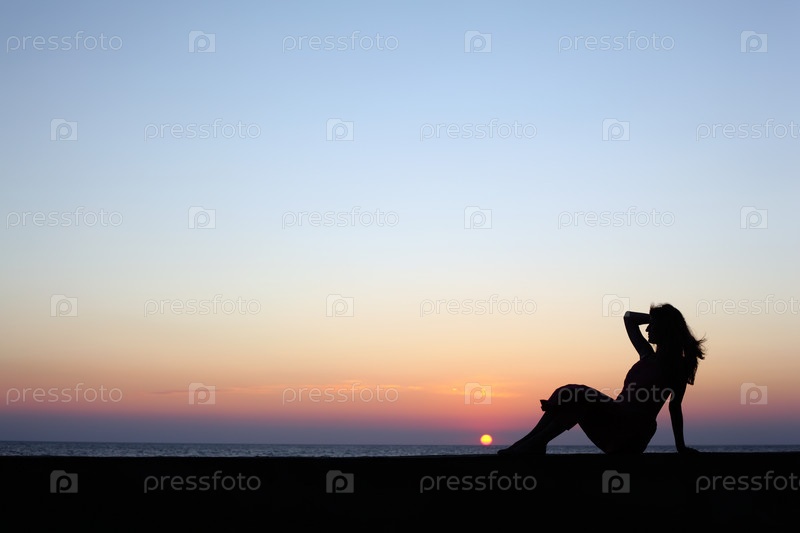 Силуэт женщины на фоне заката на пляже
