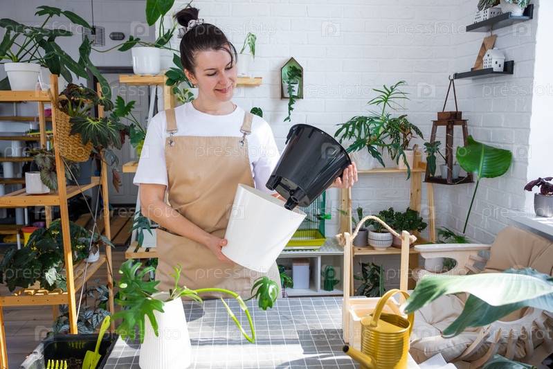 Женщина в фартуке держит горшок с двойным дном и автоматическим поливом для посадки укоренившихся черенков домашнего растения филодендрона майонеза. Посадка и уход, теплица. Макет, дренажный вкладыш