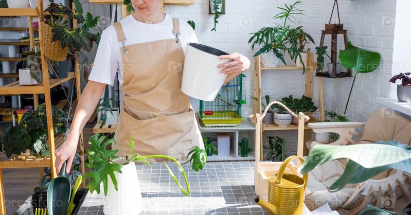 Женщина в фартуке держит горшок с двойным дном и автоматическим поливом для посадки укоренившихся черенков домашнего растения филодендрона майонеза. Посадка и уход, теплица. Макет, дренажный вкладыш
