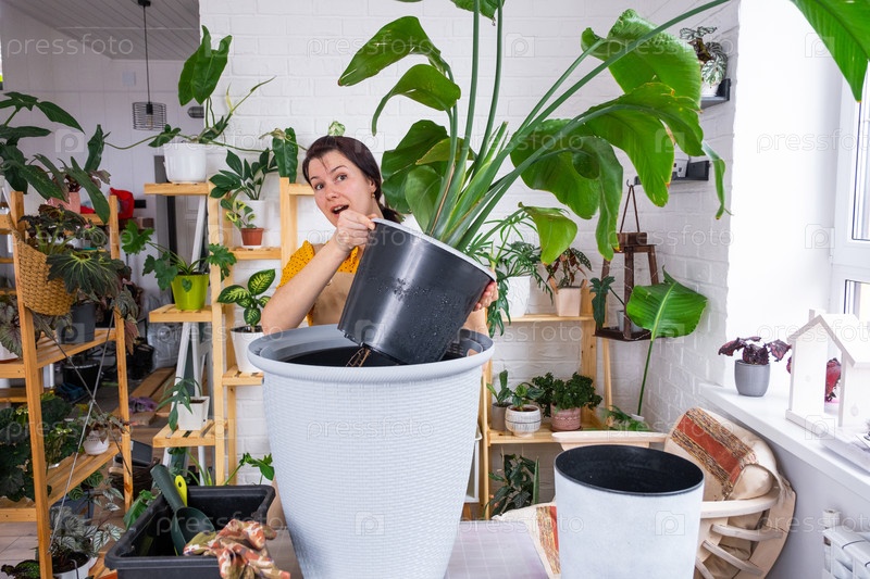 Пересадка домашнего растения стрелиция николай в новый горшок большая корзина в домашнем интерьере. Женщина в фартуке, удивленная большим размером, ухаживает за растением в горшке, стрелиция королевская