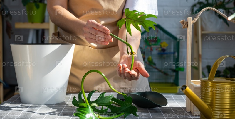 Женщина в фартуке держит укоренившийся стебель домашнего растения филодендрон майонез для посадки в белый горшок, макет шаблона. Посадка и уход, теплица