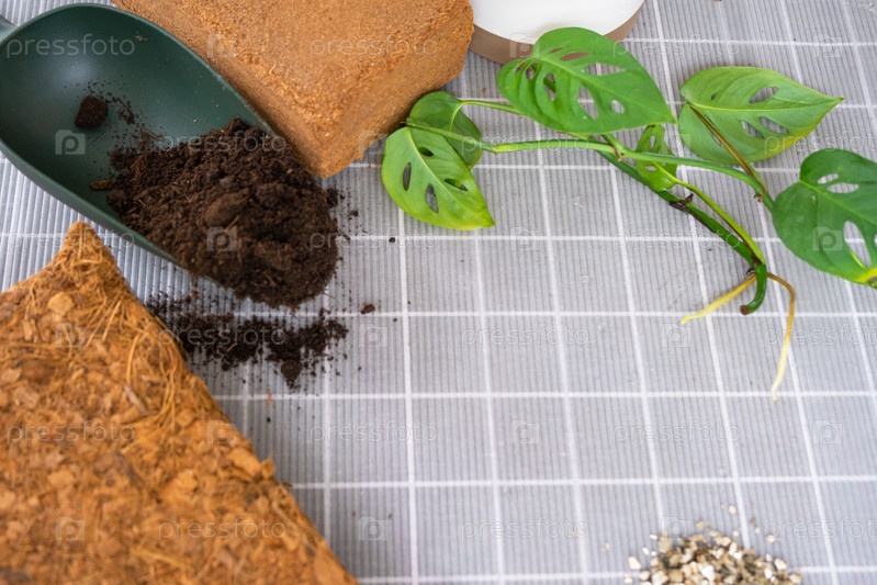 Ингредиенты для пересадки домашних растений, состав почвы, дренаж, кокосовый брикет и кокосовая стружка, вермикулит и торф, росток монстеры Адансона с корнями на столе, вид сверху