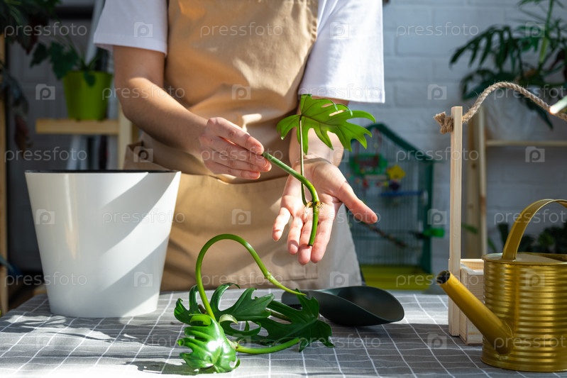 Женщина в фартуке держит укоренившийся стебель домашнего растения филодендрон майонез для посадки в белый горшок, макет шаблона. Посадка и уход, теплица