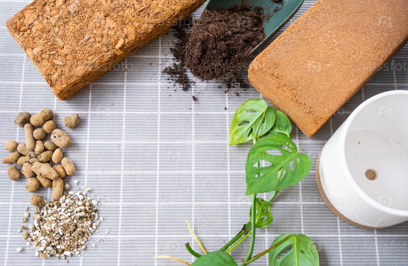 Ингредиенты для пересадки домашних растений, состав почвы, дренаж, кокосовый брикет и кокосовая стружка, вермикулит и торф, росток монстеры Адансона с корнями на столе, вид сверху