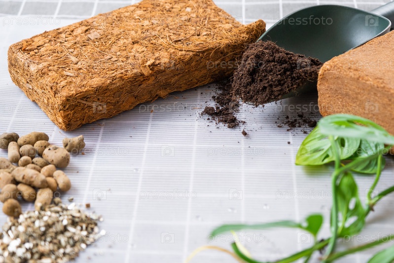 Ингредиенты для пересадки домашних растений, состав почвы, дренаж, кокосовый брикет и кокосовая стружка, вермикулит и торф, росток монстеры Адансона с корнями на столе, вид сверху