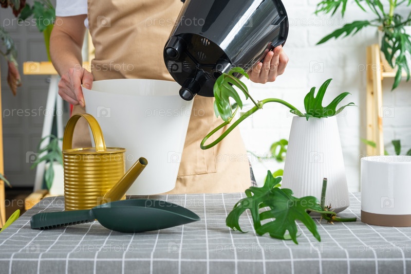 Женщина в фартуке держит горшок с двойным дном и автоматическим поливом для посадки укоренившихся черенков домашнего растения филодендрона майонеза. Посадка и уход, теплица. Макет, дренажный вкладыш