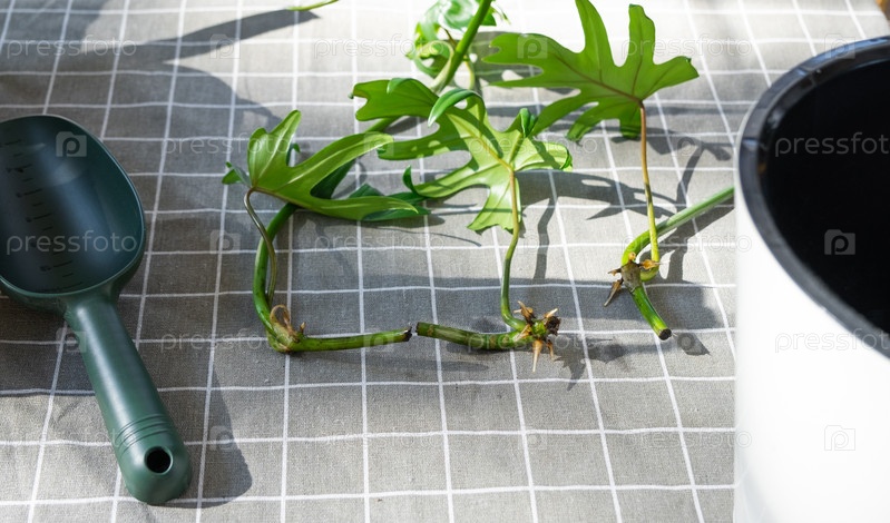 Макет на столе ростка филодендрона с корнями и оборудованием для посадки домашних растений