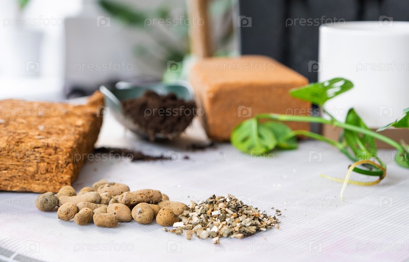 Ингредиенты для пересадки домашних растений, состав почвы, дренаж, кокосовый брикет и кокосовая стружка, вермикулит и торф, росток монстеры Адансона с корнями на столе, вид сверху