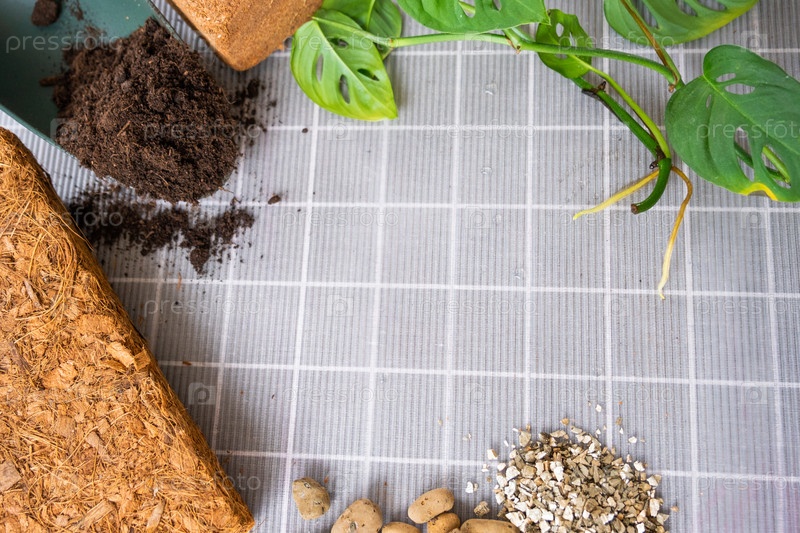 Ингредиенты для пересадки домашних растений, состав почвы, дренаж, кокосовый брикет и кокосовая стружка, вермикулит и торф, росток монстеры Адансона с корнями на столе, вид сверху
