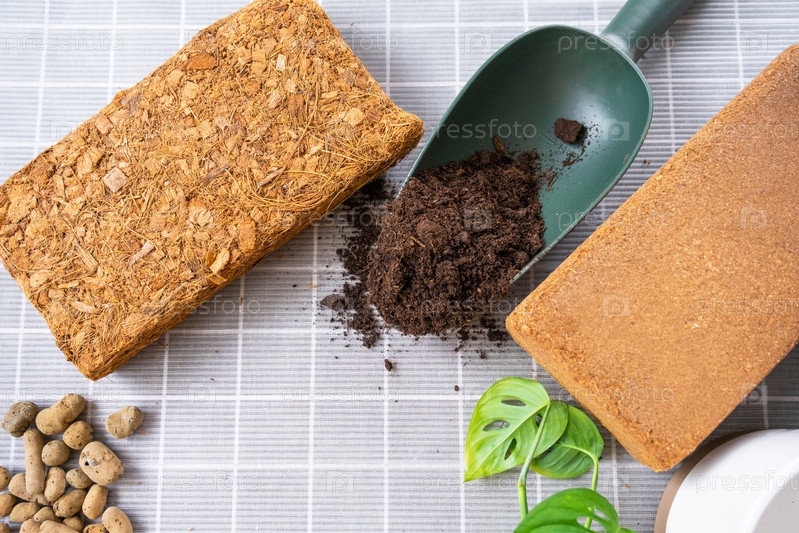 Ингредиенты для пересадки домашних растений, состав почвы, дренаж, кокосовый брикет и кокосовая стружка, вермикулит и торф, росток монстеры Адансона с корнями на столе, вид сверху