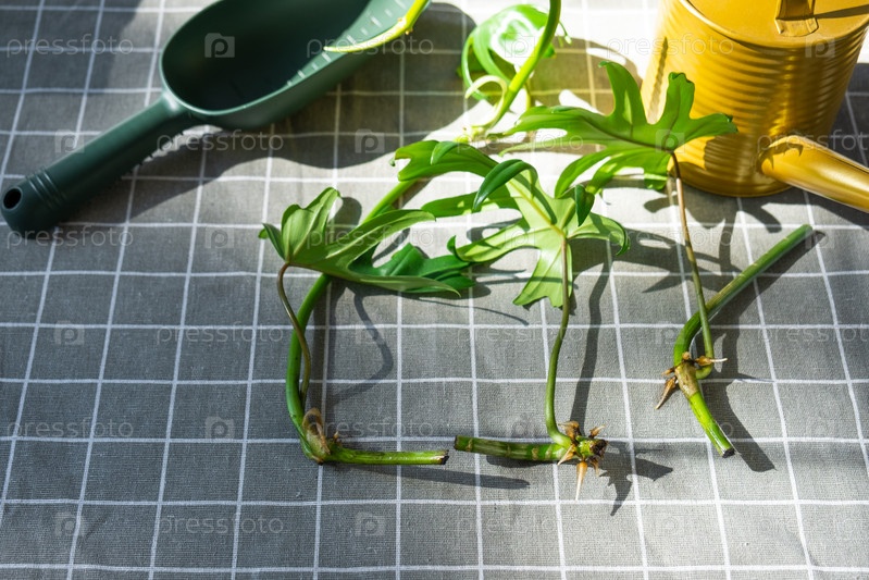 Макет на столе ростка филодендрона с корнями и оборудованием для посадки домашних растений